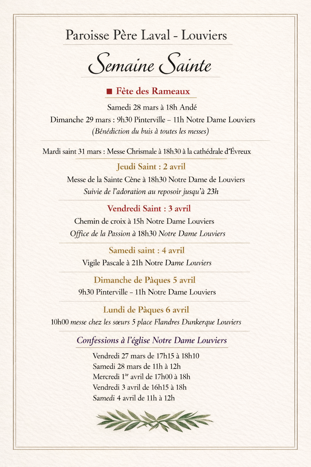 La Semaine Sainte commence aujourd’hui, avec le dimanche des Rameaux. Entrez dans cette semaine si particulière aux côtés de la paroisse, pour suivre le Christ pas à pas : de la joie de son entrée à Jérusalem, à l’épreuve de la Croix, jusqu’à la lumière de sa Résurrection.
